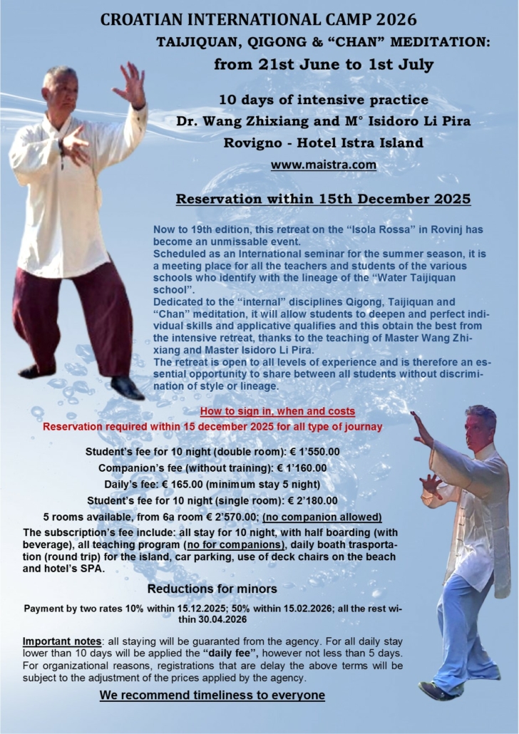 Dedicated to the “internal” disciplines Qigong, Taijiquan and “Chan” meditation, it will allow students to deepen and perfect individual skills and applicative qualities and thus obtain the best from the intensive retreat, thanks to the teaching of Master Wang Zhixiang and Maestro Isidoro Li Pira.